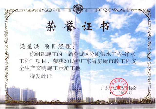 熱烈慶祝我公司“新會(huì)城區(qū)分質(zhì)供水工程-凈水工程”榮獲廣東省房屋市政工程安全生產(chǎn)文明施工示范工地。