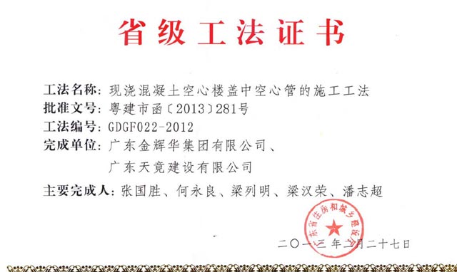 熱烈慶祝我公司工法“現(xiàn)澆混凝土空心樓蓋中空心管的施工工法”獲得省級工法。