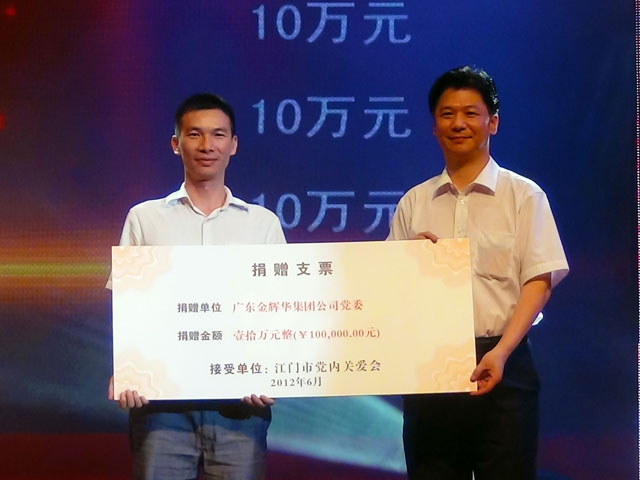 6月29日,中共江門市委組織部、江門市“兩新”組織黨工委在東湖影劇院舉辦“唱響主旋律,喜迎十八大”文藝晚會,江門市“黨內(nèi)關(guān)愛工程”啟動儀式為晚會揭開序幕,我集團(tuán)公司董事長張國球先生現(xiàn)場捐贈10萬元,為“書記項(xiàng)目”——“以黨員企業(yè)家引領(lǐng)黨內(nèi)關(guān)愛工程”出一份力。 圖為集團(tuán)公司董事長張國球先生向江門市黨內(nèi)關(guān)愛會捐款晚會上,我集團(tuán)公司選送了具有開平僑鄉(xiāng)特色的文藝節(jié)目《洋妞看碉樓》,以精采的表演歌頌和贊揚(yáng)黨