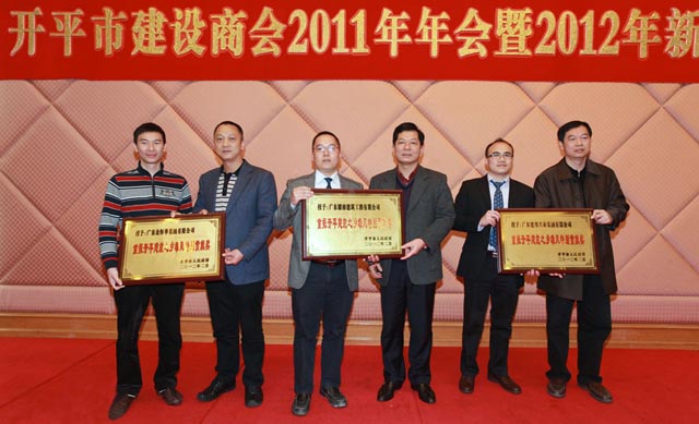 2012年2月28日下午,市領(lǐng)導(dǎo)黃耀雄、文彥、張星杰、梁和平、陳偉成、鄺業(yè)禮、凌華威、黃繼燁出席建設(shè)商會(huì)2011年年會(huì)暨2012年新春宴會(huì)。此次宴會(huì)旨在表彰先進(jìn),弘揚(yáng)典型,為推動(dòng)重振開平建筑之鄉(xiāng)雄風(fēng)工作再創(chuàng)輝煌。在過去一年里,許多建筑單位在企業(yè)發(fā)展、科技創(chuàng)新、繳納稅收等方面成績(jī)顯著。對(duì)此市人民政府決定對(duì)我集團(tuán)公司等18家企業(yè)予以表彰。會(huì)上,市領(lǐng)導(dǎo)黃耀雄、文彥、張星杰、梁和平、陳偉成、鄺業(yè)禮、凌華威