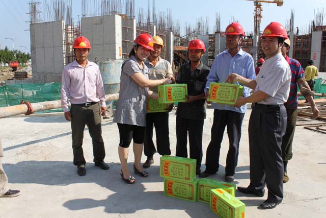 貫徹安監(jiān)總局辦公廳、衛(wèi)生部辦公廳、人力資源和社會(huì)保障部辦公廳、中華全國(guó)總工會(huì)辦公廳關(guān)于進(jìn)一步做好夏季防暑降溫工作的通知精神,保障我公司集團(tuán)員工在高溫天氣情況下安全順利的開(kāi)展各項(xiàng)施工工作,公司黨委書(shū)記張解矛、工會(huì)副主席高迎春、行政中心副主任梁沛瑩、工程管理中心鄭國(guó)燦等同志于7月23日下午來(lái)到了金輝華綜合大樓施工現(xiàn)場(chǎng),對(duì)一線施工人員在炎熱高溫環(huán)境下工作的情況進(jìn)行了親切的慰。