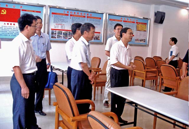 2010年9月8 日下午,江門市委政法委朱司亭副書記、江門市委黨校劉莊主任等處級干部調(diào)研班一行,在我市市委常委陳偉成、政協(xié)副主席、長沙區(qū)委書記林國寧同志帶領下蒞臨我司考察、調(diào)研及指導創(chuàng)先爭優(yōu)工作。 朱書記一行先參觀我司“創(chuàng)先爭優(yōu)宣傳欄” 及“黨工青婦活動之家”, 并詳細觀察“公開欄” 及活動照片,圖片說明,雜志架、圖書柜等;跟著到我司開發(fā)、施工、管理的“天富豪庭” 小區(qū)參觀考察,最后到我司技術中