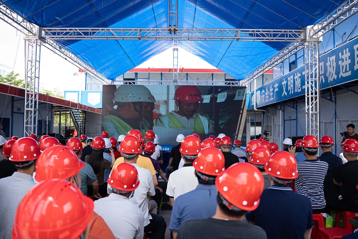 活動(dòng)現(xiàn)場(chǎng)采取“實(shí)戰(zhàn)演練+錄播回放”的形式,實(shí)現(xiàn)主會(huì)場(chǎng)與演練現(xiàn)場(chǎng)互聯(lián)互通。演練完整呈現(xiàn)了從入汛準(zhǔn)備工作、暴雨黃色預(yù)警與處置、防汛Ⅱ級(jí)應(yīng)急響應(yīng)與處置、災(zāi)后處置到演練總結(jié)的防汛防風(fēng)應(yīng)急演練全流程,重點(diǎn)演示了排查安全隱患、人員疏散、排水防澇、險(xiǎn)情處理、聯(lián)合搶險(xiǎn)救援等環(huán)節(jié),通過實(shí)戰(zhàn)演練強(qiáng)化工地應(yīng)急預(yù)案的可操作性,檢驗(yàn)跨小組協(xié)同、應(yīng)急響應(yīng)和突發(fā)事件應(yīng)急處置能力。