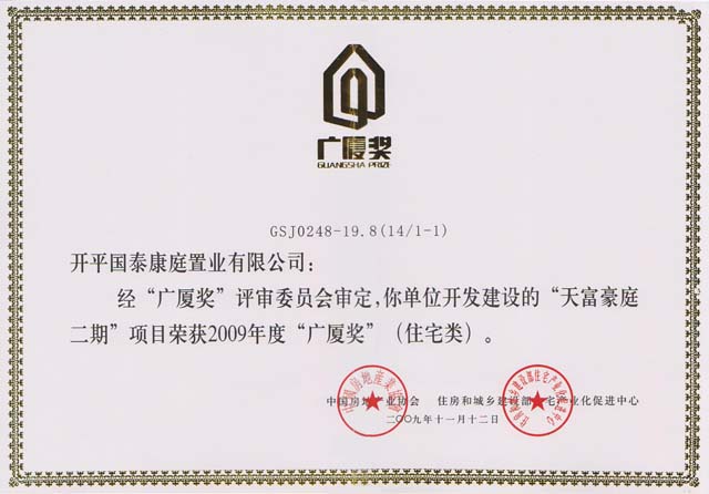 熱烈慶祝天富豪庭二期項(xiàng)目榮獲2009年度“廣廈獎(jiǎng)”(住宅類(lèi))